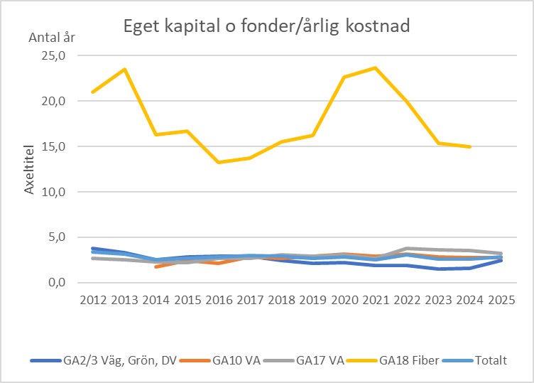 Diagrammet ovan visar hur länge föreningens sparade medel i form av eget kapital och fonder skulle räcka för att täcka föreningens årliga kostnader. Våra anläggningars värden är inte medtagna i beräkningen.